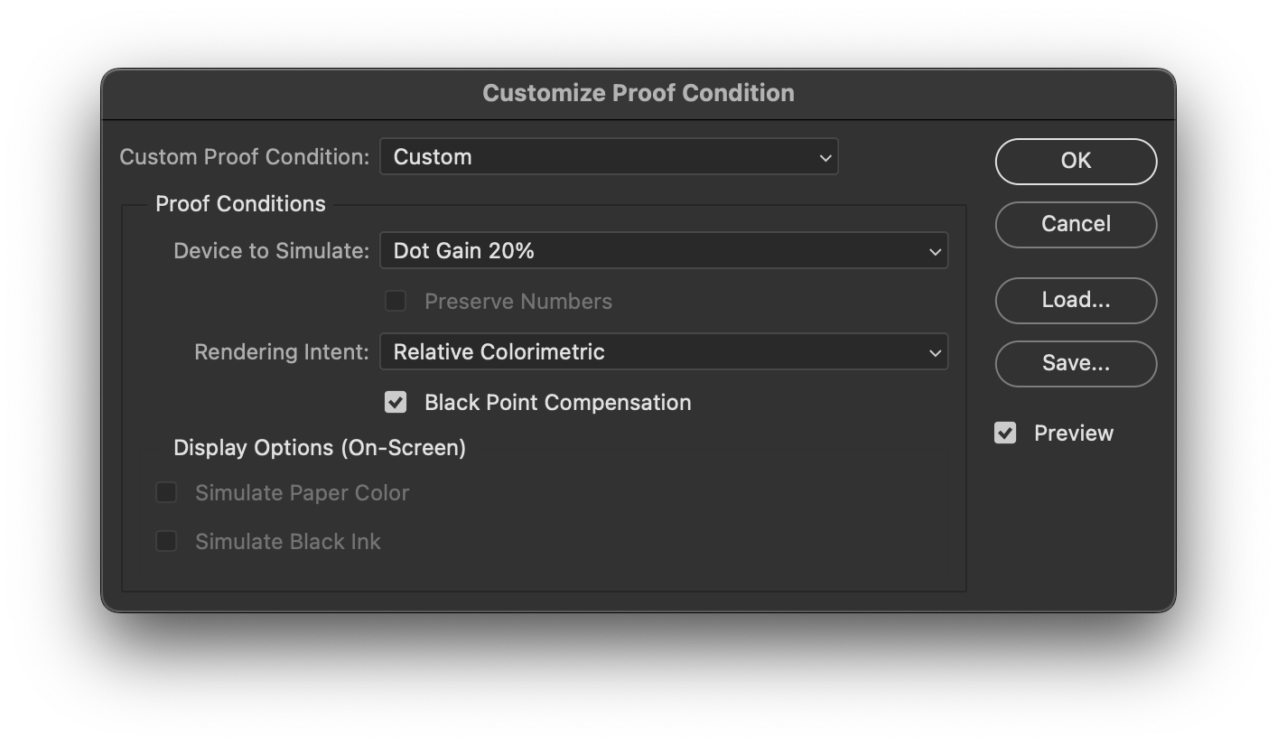 - Under Proof Conditions > Device to Simulate: select Dot Gain 20%;